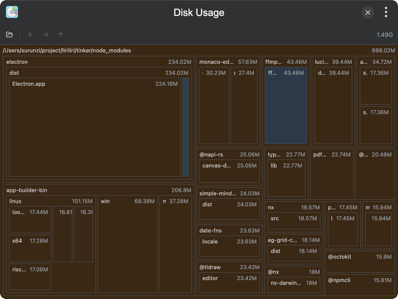 除了之前发过的空间分析小工具,另外又增加了重复文件跟大文件清理。GitHub 仓库: https://github.com/liriliri/tinker 磁盘空间分析  重复文件清理