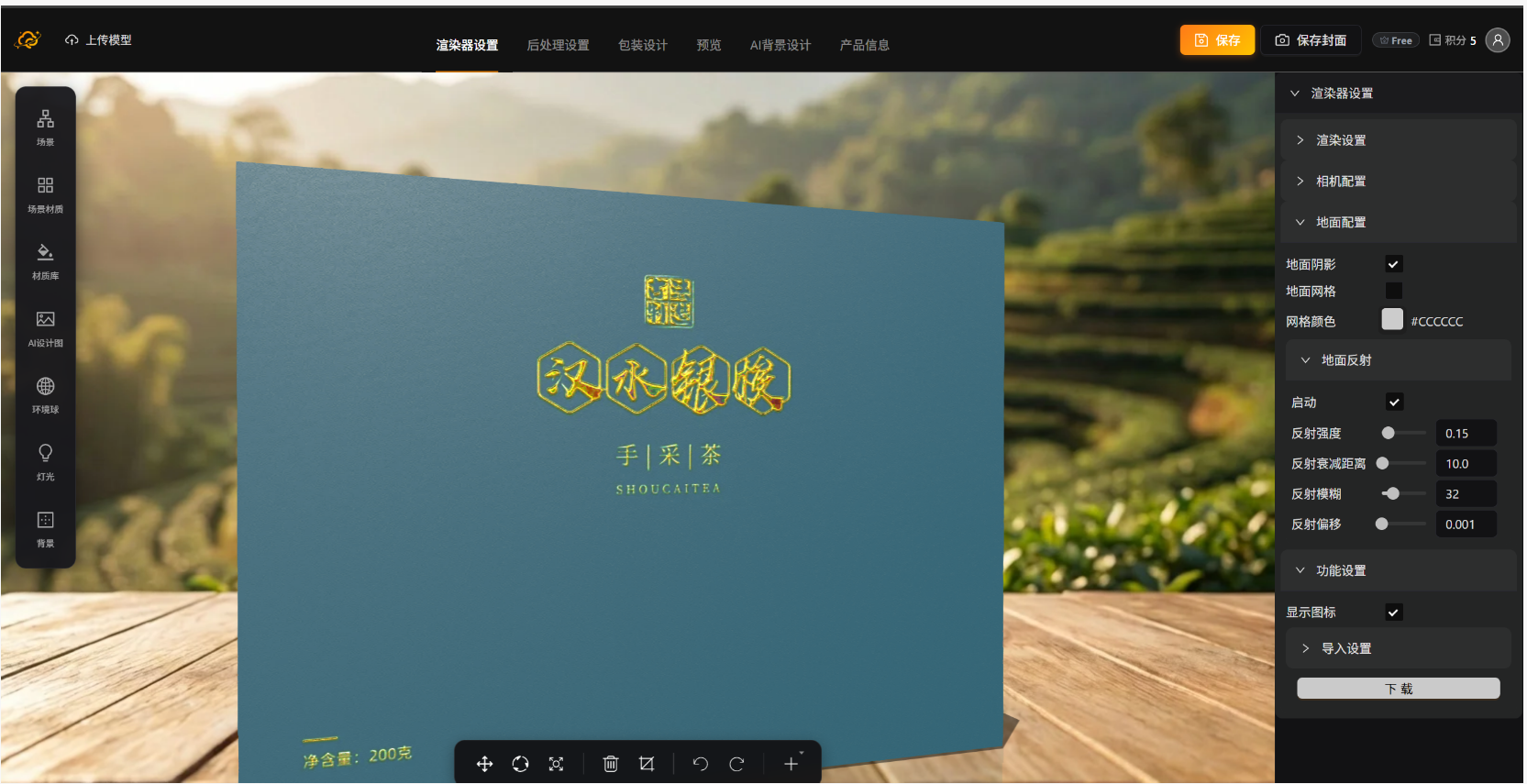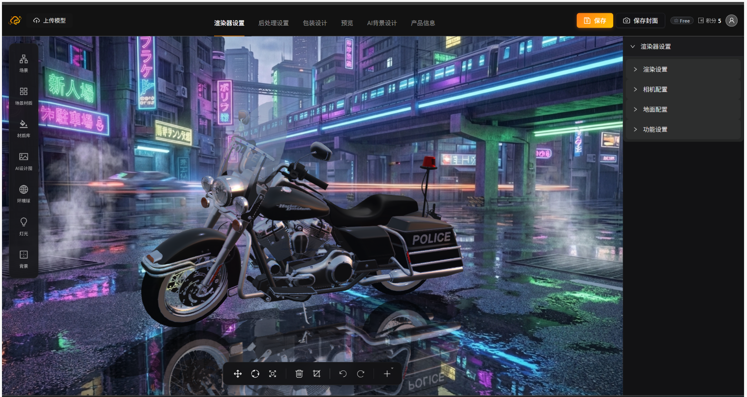 里面内置后处理,灯光,环境球,自定义材质库,AI辅助设计,AI背景设计,AI设计图提取功能,大大降低设计人员的门槛。